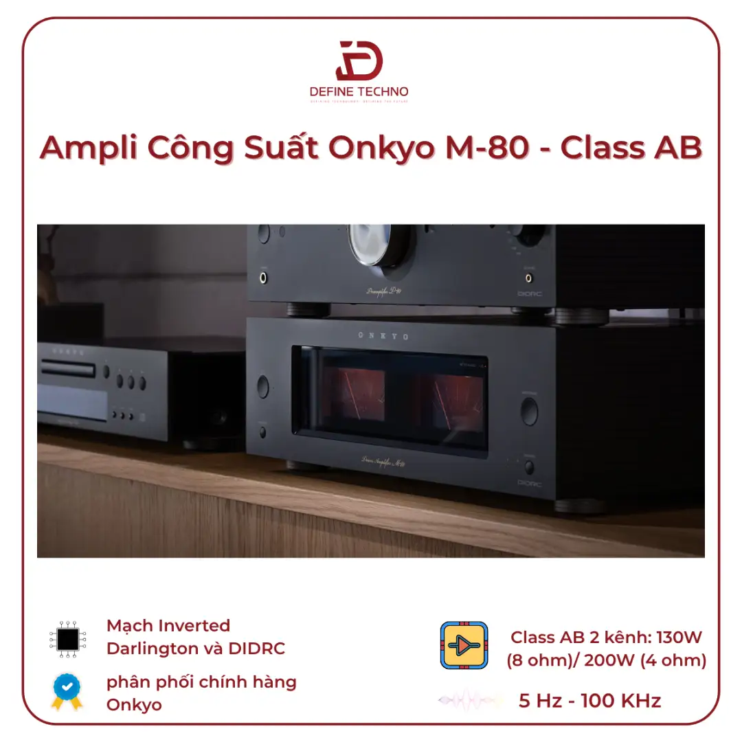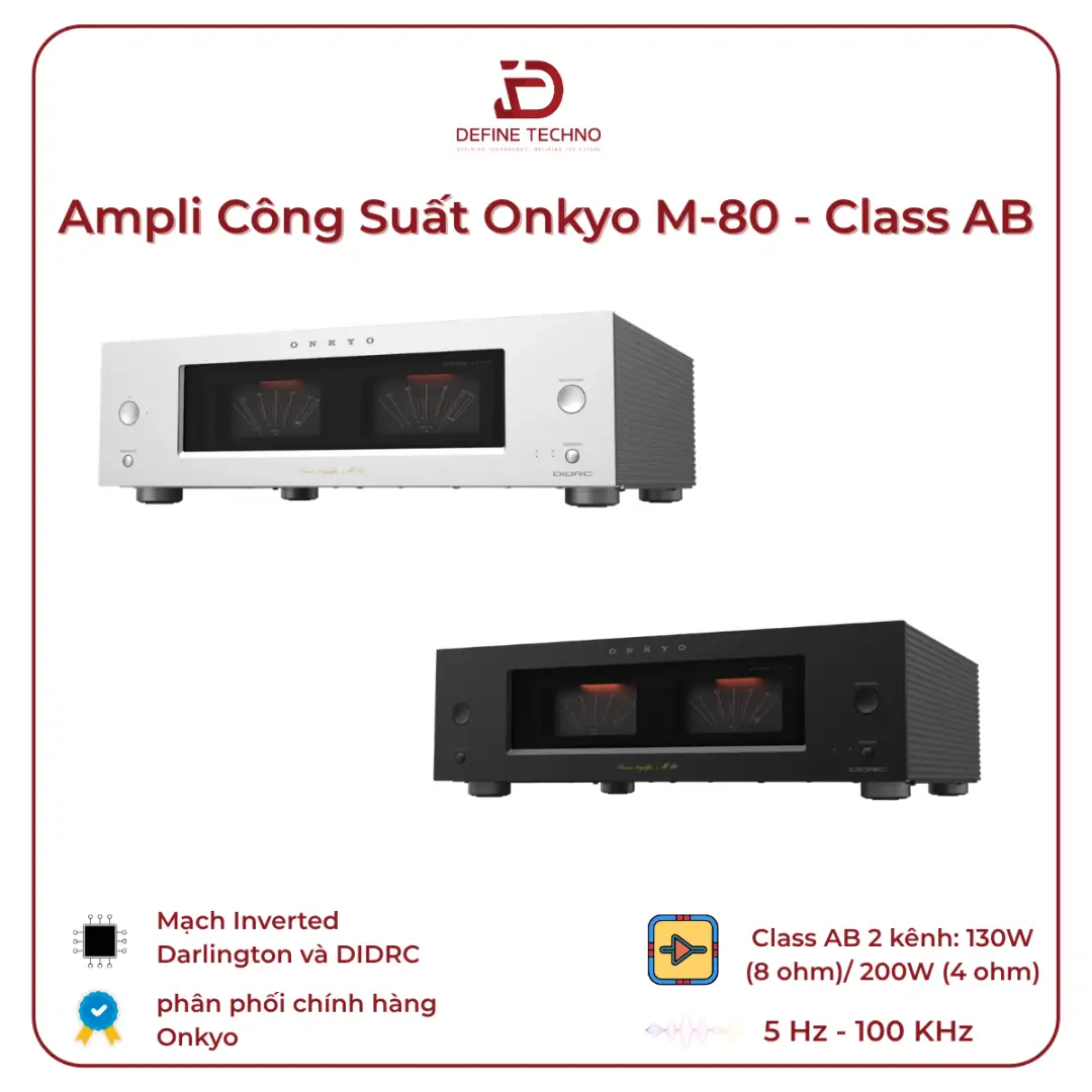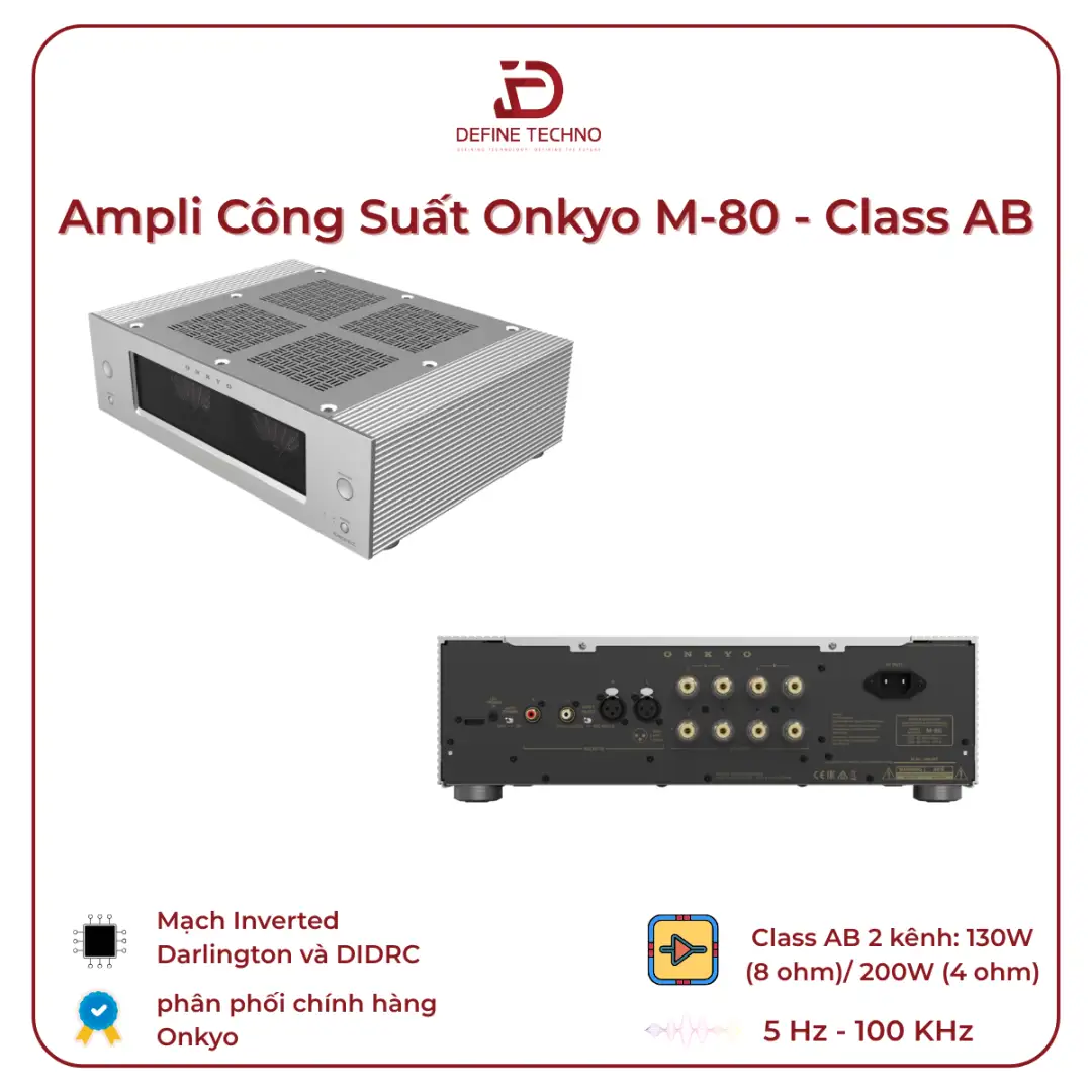 Onkyo M-80 sử dụng mạch khuếch đại Class AB, cho công suất 130W mỗi kênh ở trở kháng 8Ω và lên đến 200W mỗi kênh ở 4Ω. Đây là mức công suất phù hợp để phối ghép với nhiều dòng loa bookshelf và loa cột phổ biến, đồng thời giúp ampli hoạt động ổn định trong thời gian dài mà không rơi vào trạng thái quá tải hay suy hao hiệu suất.
