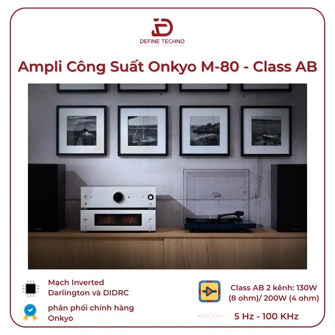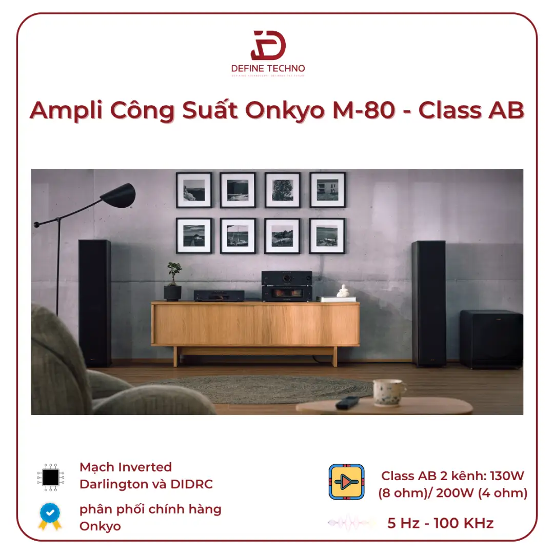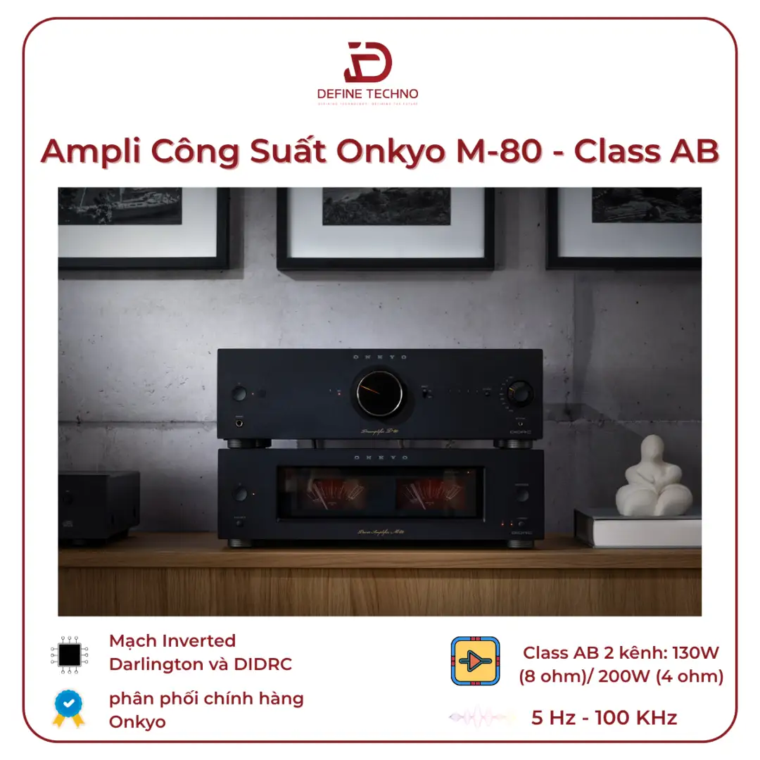 Onkyo M-80 sử dụng mạch khuếch đại Class AB, cho công suất 130W mỗi kênh ở trở kháng 8Ω và lên đến 200W mỗi kênh ở 4Ω. Đây là mức công suất phù hợp để phối ghép với nhiều dòng loa bookshelf và loa cột phổ biến, đồng thời giúp ampli hoạt động ổn định trong thời gian dài mà không rơi vào trạng thái quá tải hay suy hao hiệu suất.